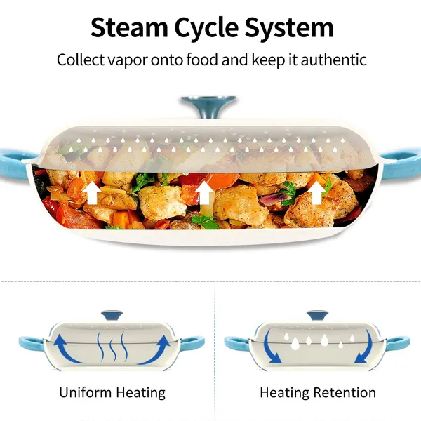 • Self-circulating Lid-This Casserole is design with circulating shower type lid, designed to catch steam as it rises in the pot & condense the steam back into water inside the lid,evenly fall on the food to maintain the original nutrition.