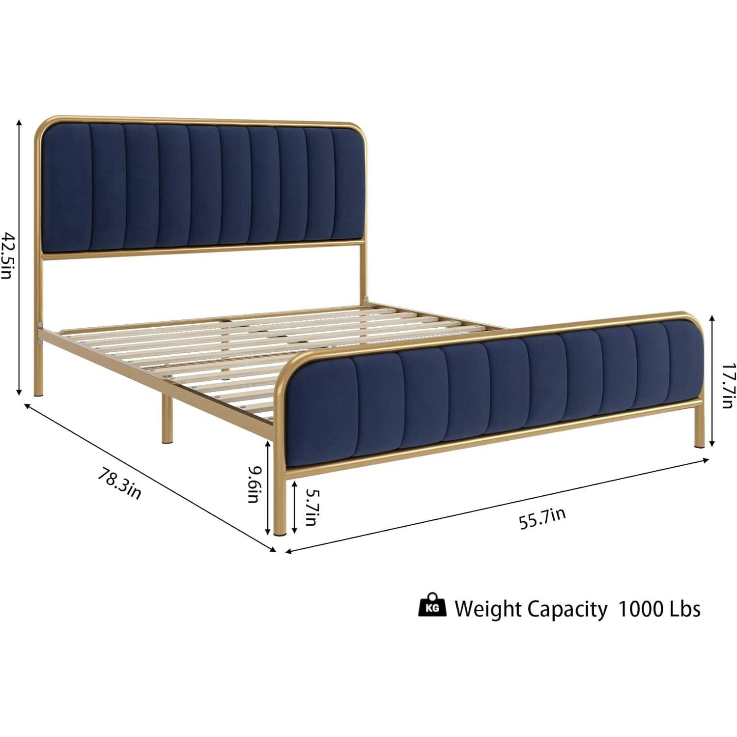 Full Gold Metal Platform Bed Frame with Navy Blue Velvet Upholstered Headboard