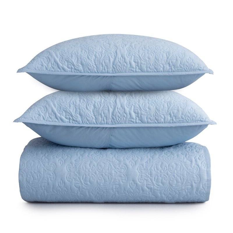 King Size Cotton 3-Piece Quilt Set in Blue with Quilted Damask Pattern