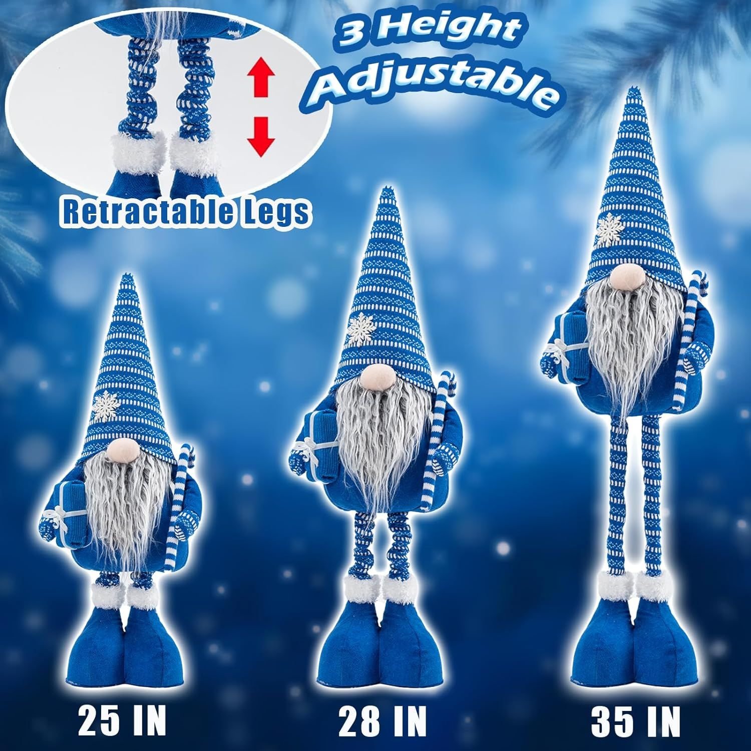 Big Retractable Spring Legs Blue Christmas Gnome Plush: Large Xmas Gnome Height adjustable 25-35inches Plush is at an adorable price, just add them to the cart, you and your family will get more fun from this Xmas elf dolls during the Christmas party favor.Classical Christmas Characters: There are many Xmas elements on our Christmas gnome, such as the hands hold the candy cane and gift box, the hat has a snowflake and the handmade striped blue exterior, it's cute and charming, we are confident that you will love them.Three Adjustable Size & Good Quality: Adjustable 25-28-35inches tall from bottom to top of the bendable hat with built-in wire, makes this christmas gnome plush look so cute, it's 100% handmade of soft and high quality material, also have long white beard and bulbous nose.Home Decor for Christmas: The big blue xmas gnome plush ornaments always defend the warmth and hope of the winter, also protect people from hungry and coldness, which will be the perfect Christmas decorations for a special place in your home, and the hit of your table decorations for office and home.Gift Choice for Christmas: This lovely plush gnome represents happiness and hope, will not only bring good luck to your family, but also the courage to fight against difficulties. Perfect gift for Birthdays, Thanksgiving, Christmas holidays, and New Year decorations.