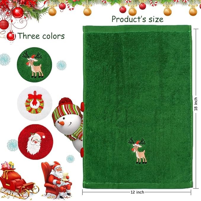 [100% Cotton Towels ] These Christmas dish towels are made of cotton which is soft for you to touch and comfortable for you to use, not easy to deform or damage; they have high water-absorbent quality, also very durable and reusable��[Christmas Decorations]The Christmas themed embroidery and beautiful color on these towels provides you a festival feel at home. Add the finishing touch to your kitchen with this charming cotton towel. You can place the towels on Christmas dinner table, bathroom, wash basin and kitchen, etc as festival decor to illuminate your festival.��[Widely Usage] Suitable for bathroom (washing your hand & face), wash basin (drying hands,face,etc), kitchen (cleaning the table, dishes, etc). It is a satisfied choice for many families. Having kitchen towels around is a complete must for every household. They are invaluable helpers when it comes to accidental spills, or washing and cleaning up after a meal.��[Great Gift Choice]Each set contains 3 Christmas towels, white, red, and green; Perfect gift for Christmas, Thanksgiving, party, holidays, birthdays, housewarming, hostess gifts and more.
